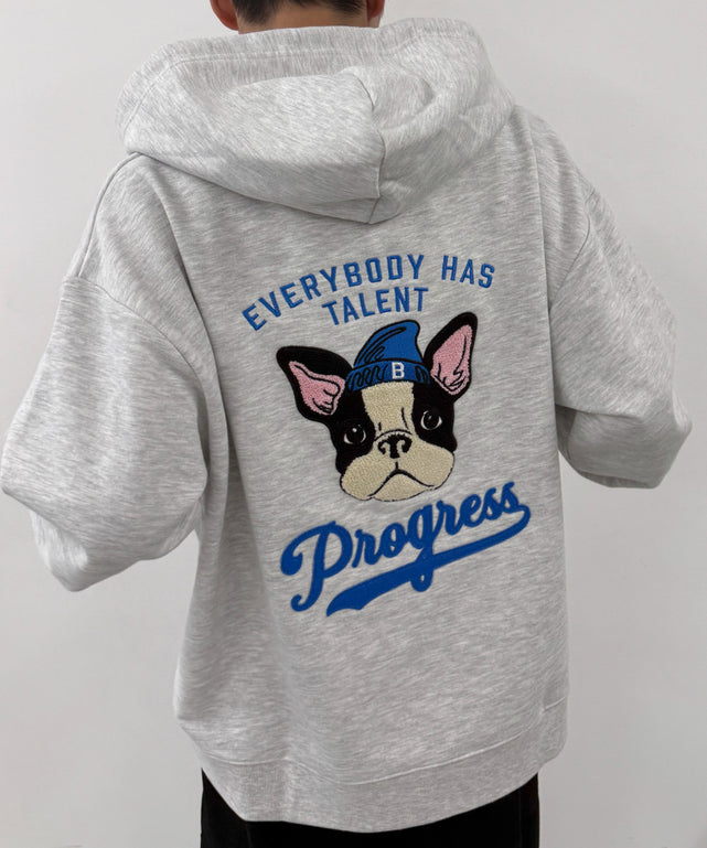 【バックのDOGモチーフのサガラ刺繍が印象的なDOGサガラジップパーカー】