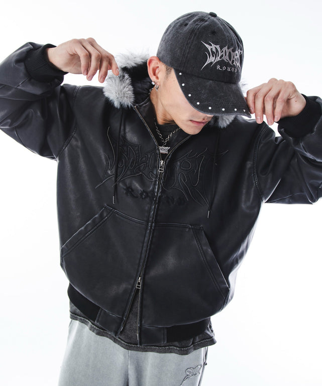【フィードまわりのグレーのフェイクファーが目を引くストリードムード漂うPUパファーブルゾン】