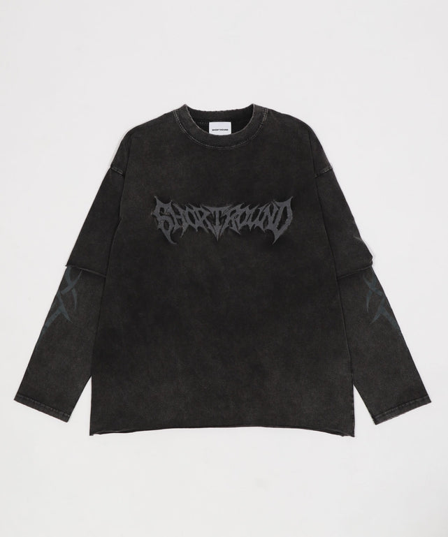 フロントにはエッジの効いたロゴグラフィックを配置し、袖部分にはタトゥー調プリントを施すことで、存在感のあるレイヤード風デザインに仕上げました。