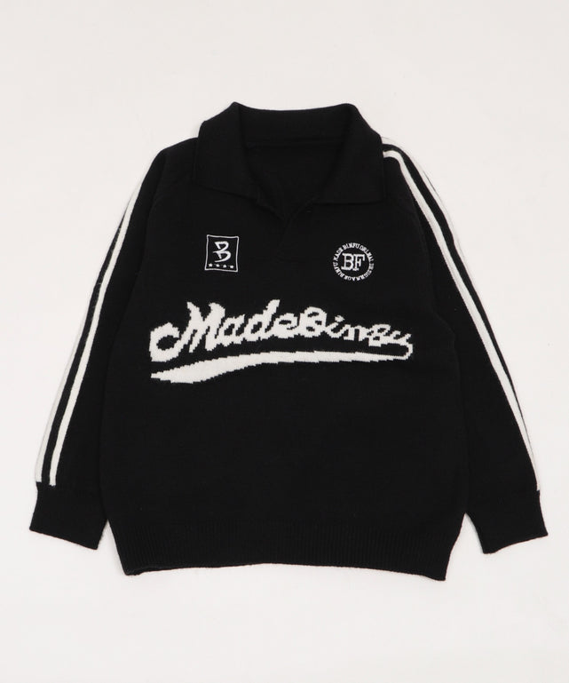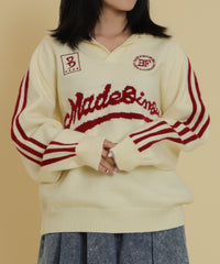 ライン入りスリーブと大胆な筆記体ロゴがアイコニックな、レトロゲームテイストのニットポロ。