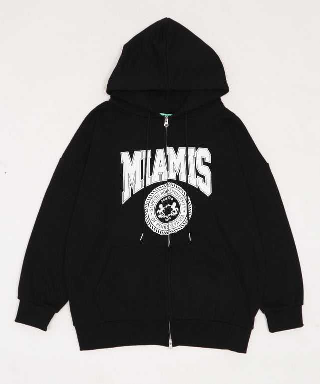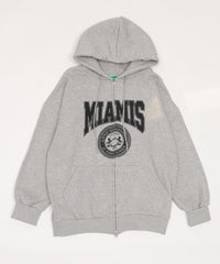 ゆったりとしたビッグシルエットに、存在感のあるカレッジロゴをのせたジップパーカー。