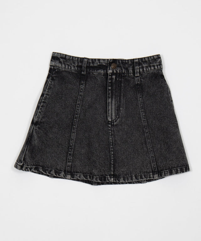 カジュアルなデニム素材を、贅沢なパネル切り替えで立体的なフレアシルエットに仕上げました。