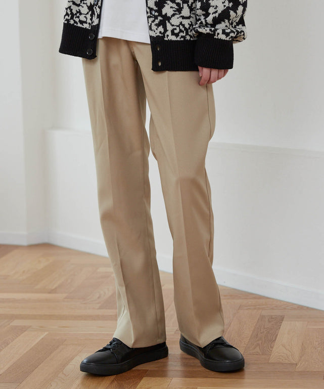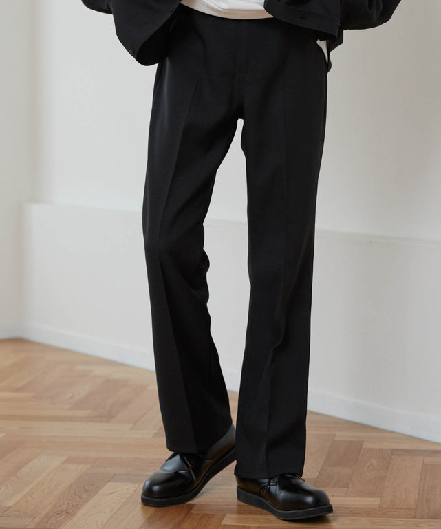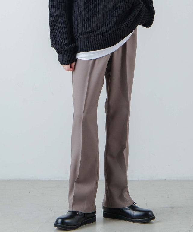 人気のフレアスラックスを肌触りがよく、程よい落ち感とツヤ感のあるポリエステル素材で仕上げアップデート。