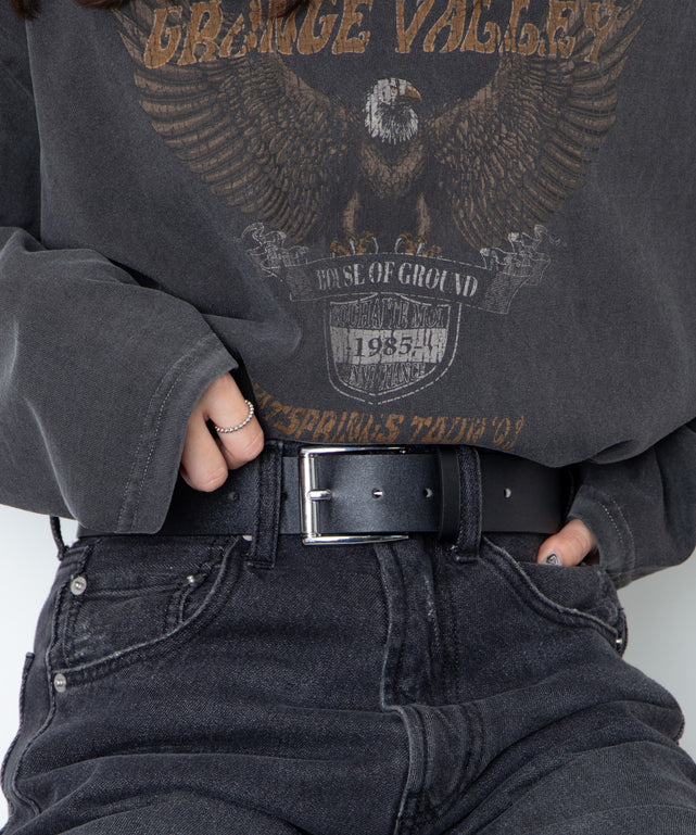 キレイ目なコーデを軸にあらゆるスタイリングで活躍するフェイクレザーのベルト。