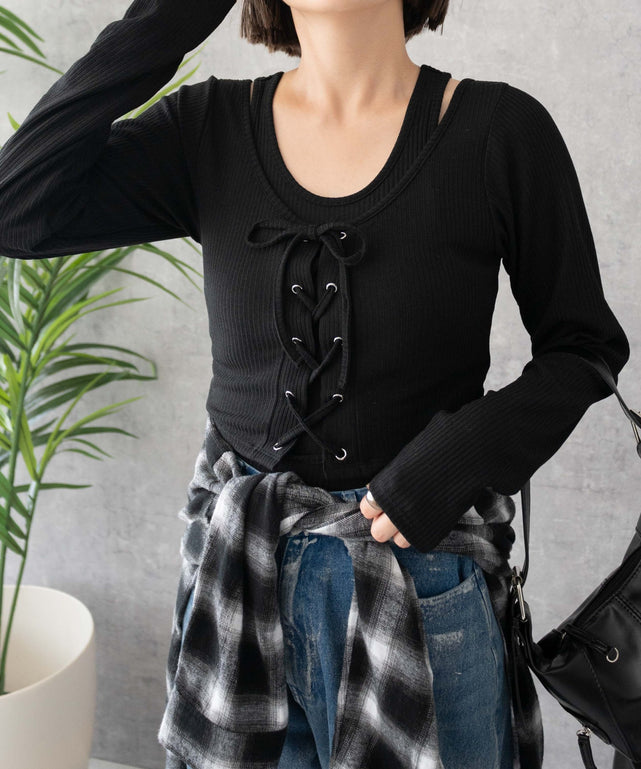 レイヤードレースアップ長袖トップス