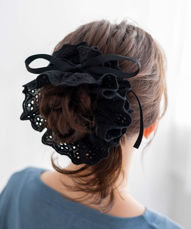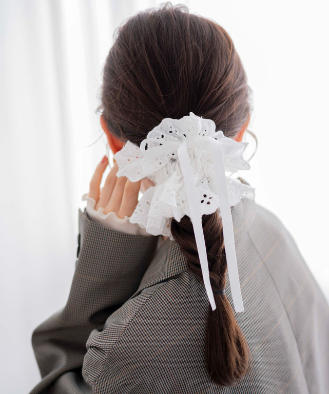 レース素材のシュシュにリボンがついたデザインなので、リボンが崩れる心配がなく位置の調整もしやすいアイテムです。