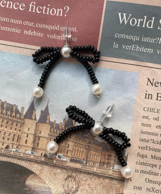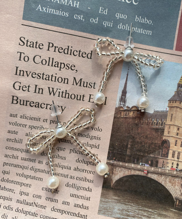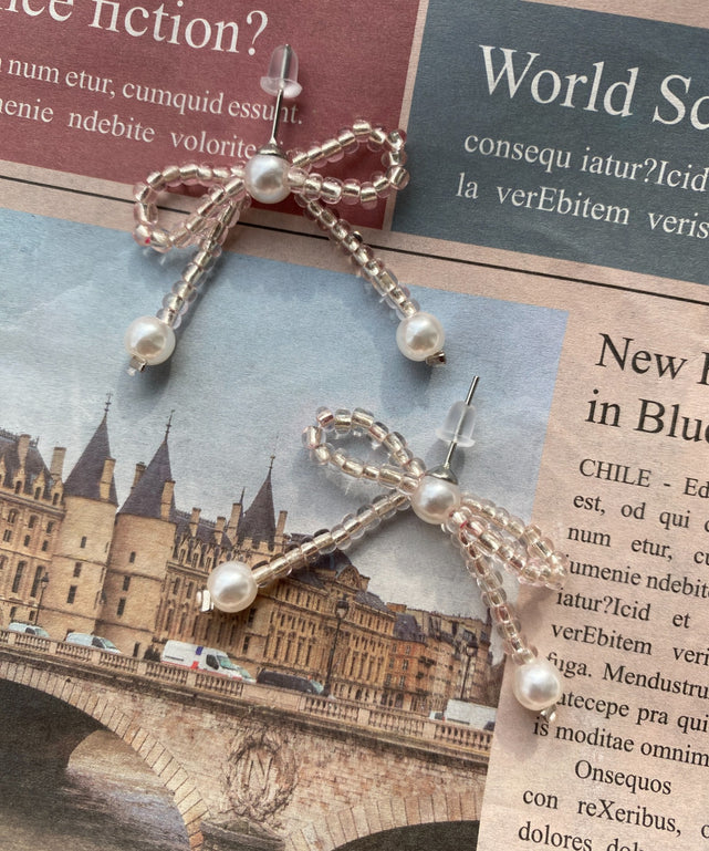 今人気のリボンモチーフをビーズでかたどったデザインのピアス。