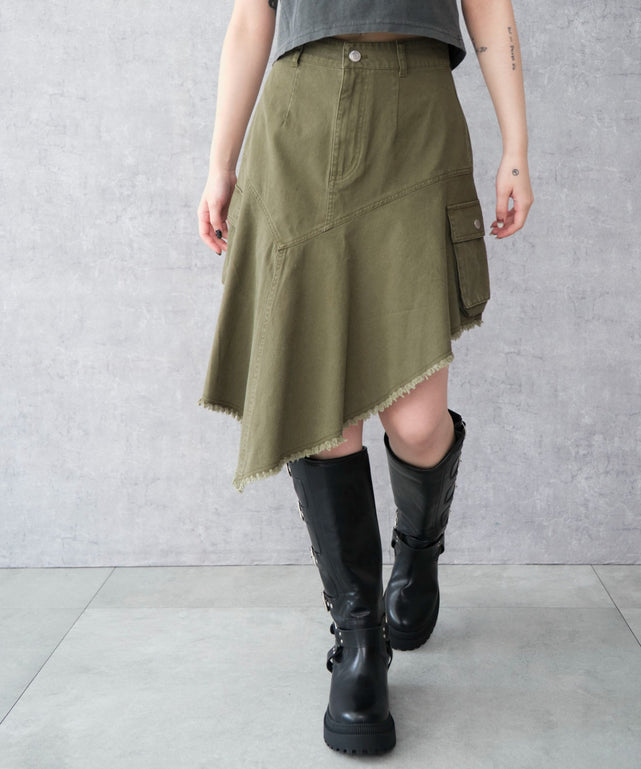 ミリタリー感漂うカーゴデザインに、動きのあるイレヘムラインを組み合わせたミドルスカート。