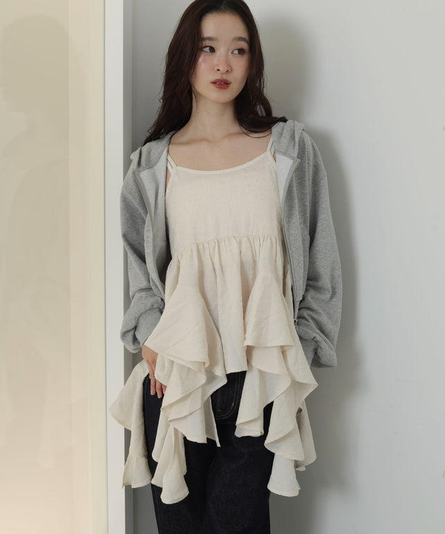 フロントのフリルディテールが甘さを引き立て、華やかな印象に♪