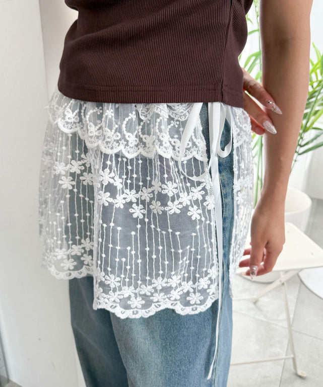 上品な透け感と華やかな刺繍が目を引く、ラップタイプのレーススカート。