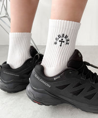 フロントにクロスモチーフとロゴ刺繍をあしらった、クールな印象のメンズソックス。