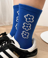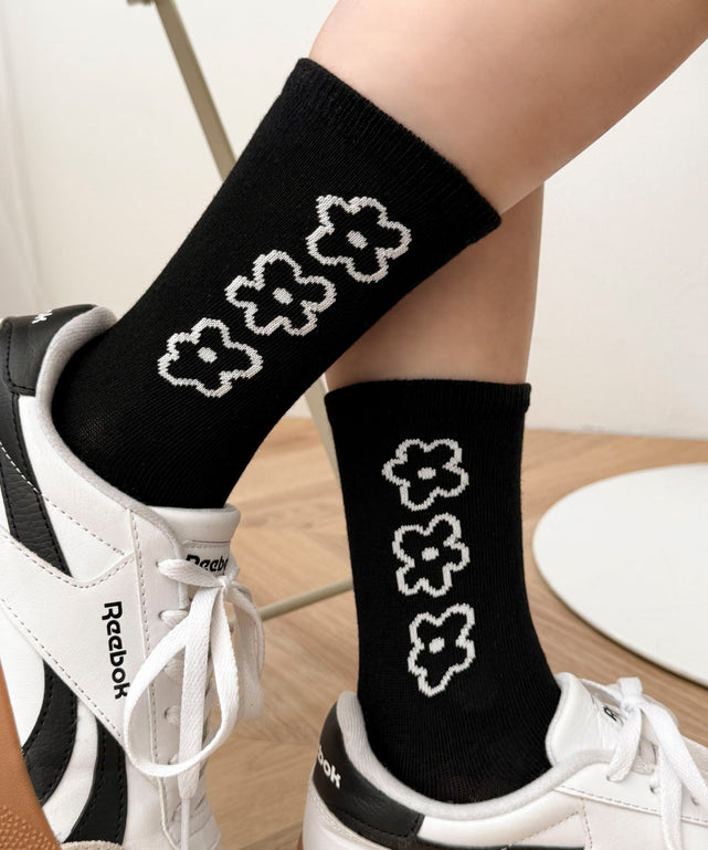 手書き風のフラワー刺繍が縦に3つ並んだ、キュートで個性的なソックス。