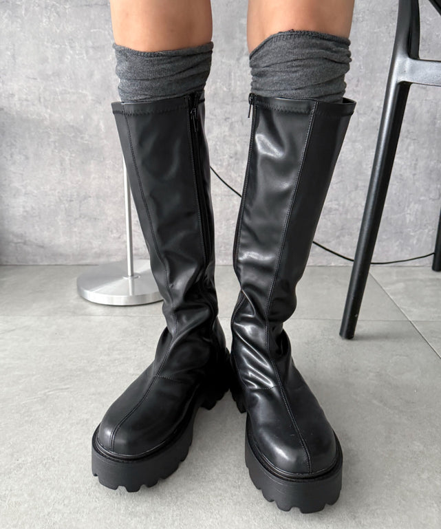 無駄を削ぎ落としたプレーンなフォルムに、厚底ソールでインパクトを効かせたロングブーツ。