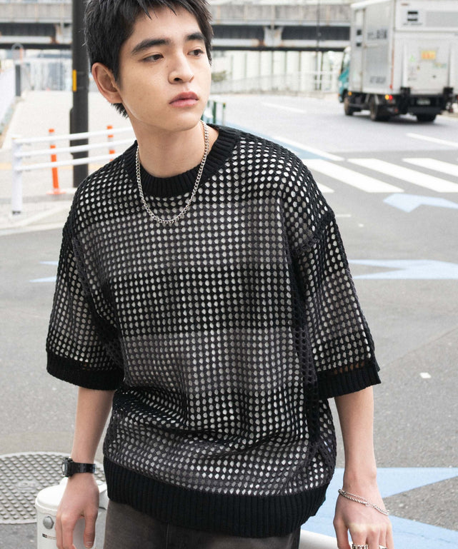 網目の粗いニットでインナーのTシャツとアンサンブルで着るタイプのニットプルオーバー。