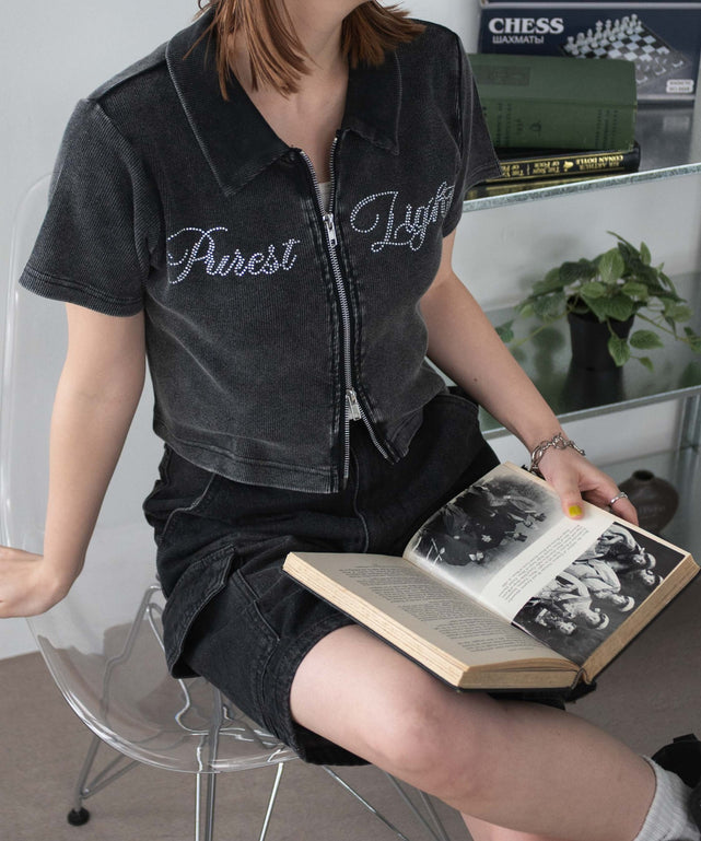 ラインストーンとフロントのダブルジップがポイントのトップス!