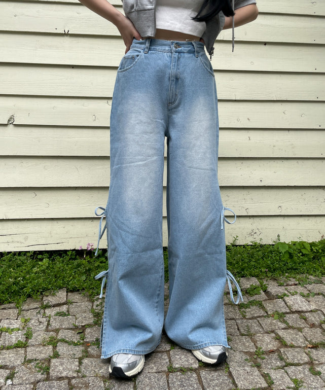 サイドスリット&リボンになっている薄手の10オンスのデニムパンツ。