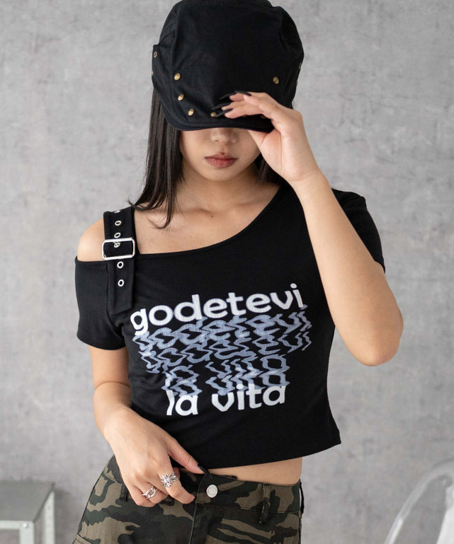 ベルトワンショルグラフィックちびT/ブラック モデル:160cm F着用