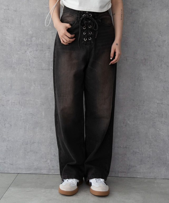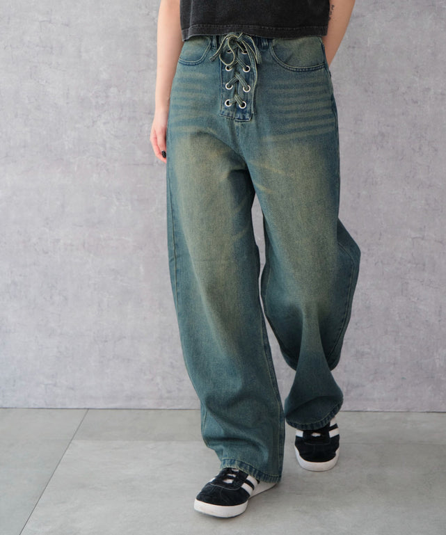 フロントのレースアップデザインがポイントのデニムパンツ。