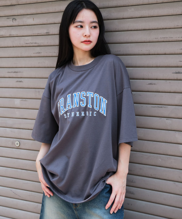 トレンド感のあるカレッジ風ロゴをフロントに大胆にプリントし、ストリートにもカジュアルにもマッチする一枚に。