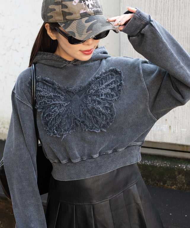 ウォッシュ加工のバタフライデザインが目を惹くショートパーカー♪