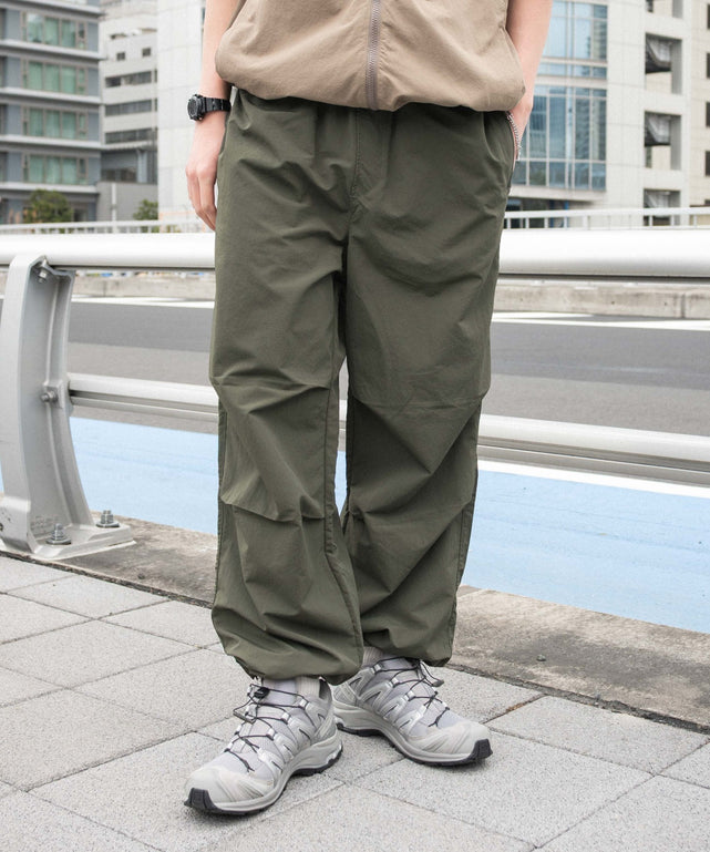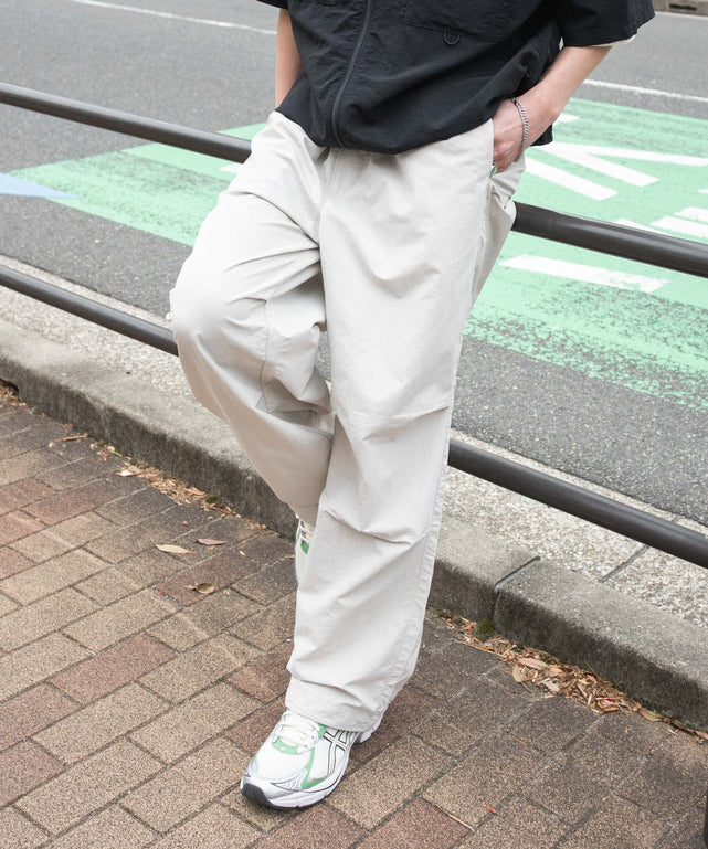 撥水ナイロングログラン地を使用、スポーティーながらワイド型で鮮度のあるパンツ。