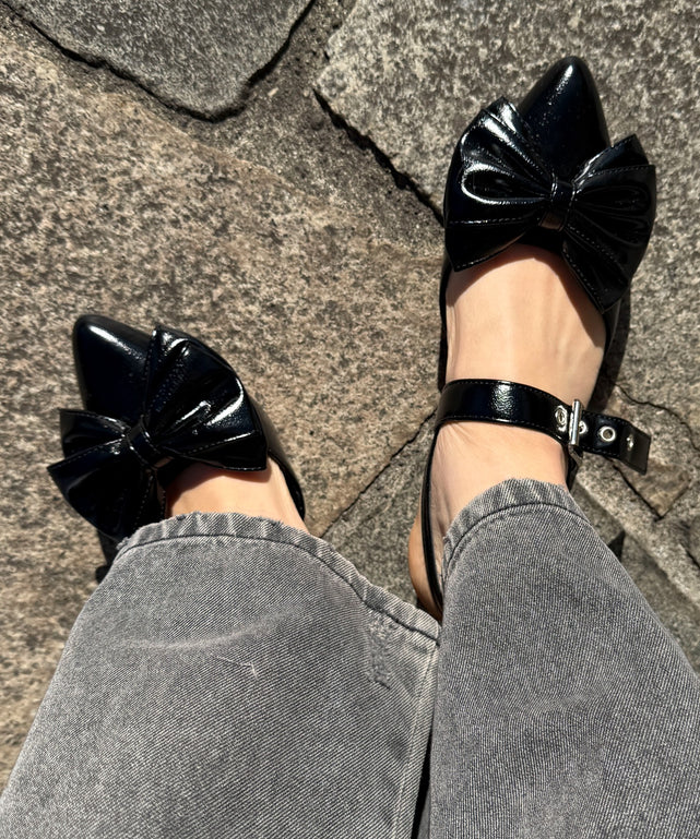 ポインテッドに大きめのリボンをMIXさせたトレンド感の要素も入れたシューズ。