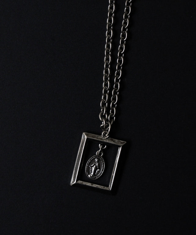 四角いフレームのなかにモチーフチャームが入ったネックレス。