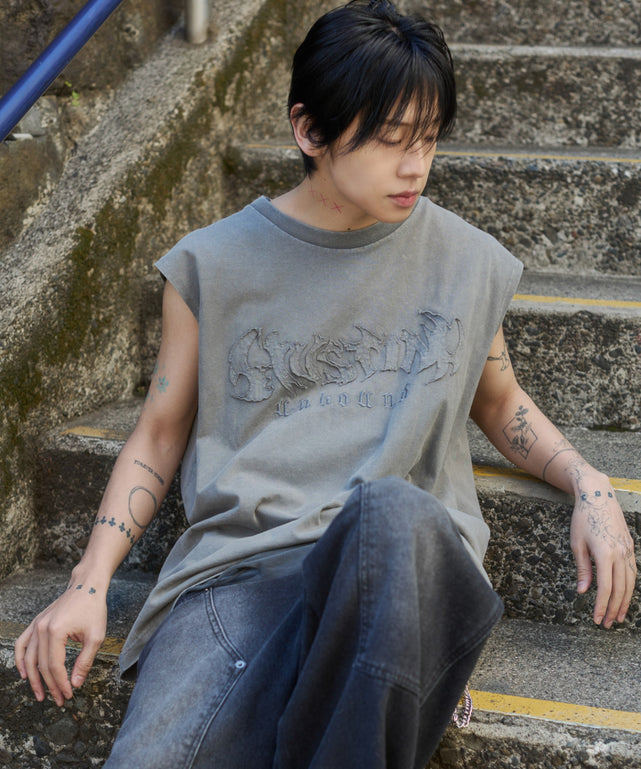 【ヴィンテージライクなブリーチ加工が目を引く、ストリート感あふれるノースリーブトップス。】