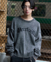 【ブリーチ加工によるムラ感と、大胆に配置されたフロントグラフィックが目を引くニットプルオーバー】
