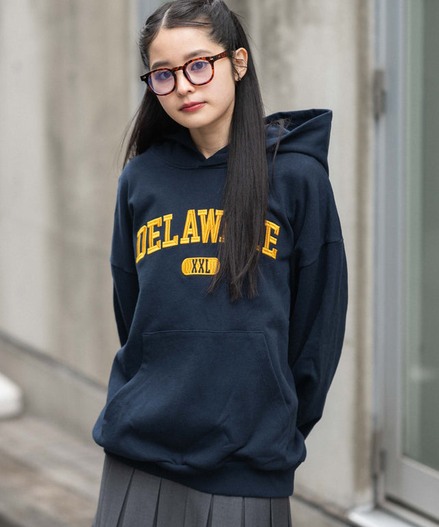 大胆な刺繍ロゴが目を引くグラフィックプルパーカー。