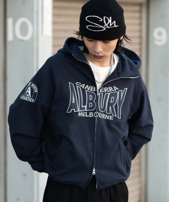 フロントには大胆なシティ名のワッペン刺繍ロゴ、袖にもワンポイントロゴを施した、コーデの主役になる一枚に仕上げました。
