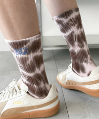 存在感のあるタイダイ柄に、さりげない刺繍ロゴをプラスしたデザインソックス。