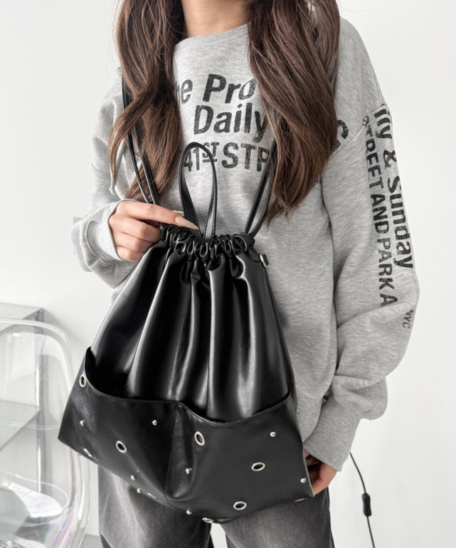 エッジの効いたハトメデザインが目を引く、ストリート感たっぷりのナップサック。