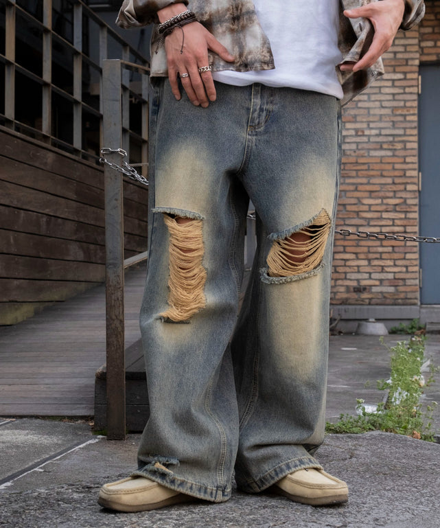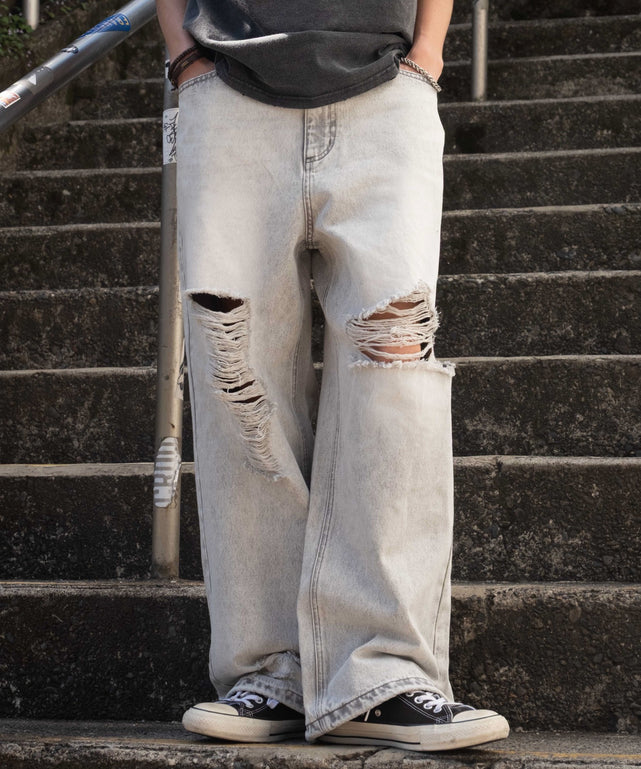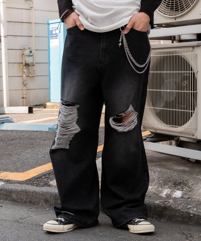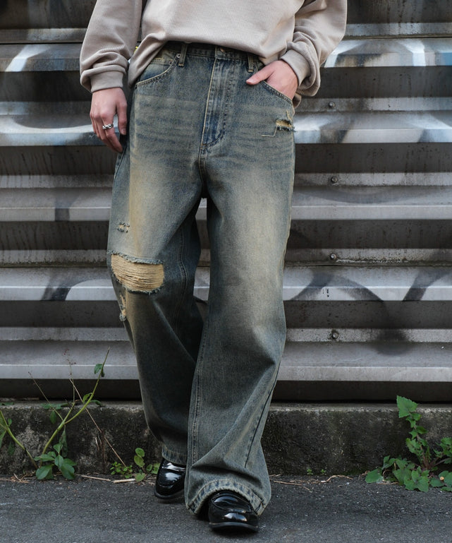 人気のバギーシルエットのパンツにダメージ加工を施したデニムパンツ。